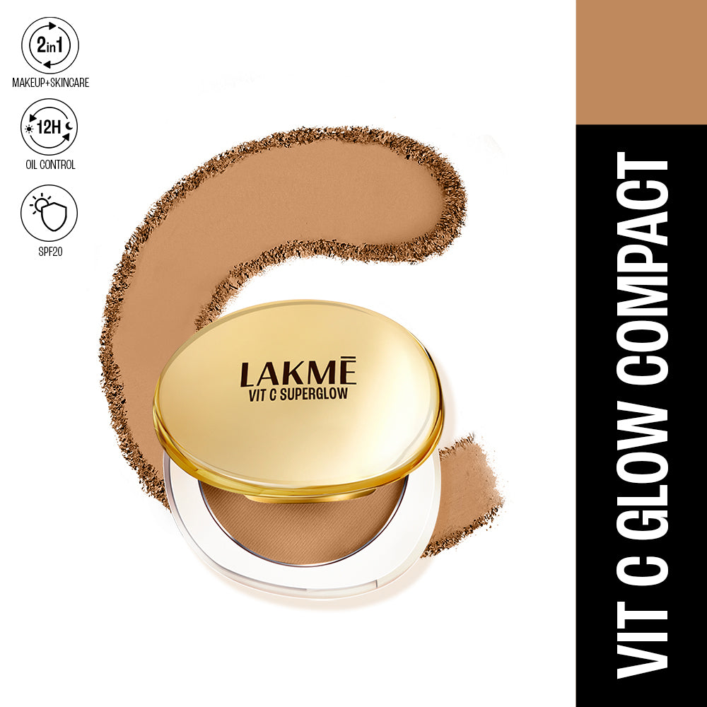 "New Lakme Superglow Skin Perfecting Compact isn't just makeup – it’s skincare first makeup. Supercharged with 1% Vitamin C + E complex, this multi-slayer illuminates your skin from within while diminishing the appearance of blemishes and blurring imperfections. With SPF 20 protection, it shields your skin from sun damage and photoaging while keeping it healthy and youthful. Indulge in the ultimate fusion of makeup and skincare with Lakme Superglow Skin Perfecting Vitamin C Compact. It's not just a beauty product - it's a daily dose of glam that's kind to your skin. Because you deserve skin that slays every day. Experience the transformative power of brightening Vit C, your secret weapon for a radiant, flawless complexion. This high-glam compact is designed to keep your skin fresh and glowing all day, offering up to 12 hours of unbeatable oil control for a long-lasting matte finish. Our innovative skin-fitting formula blends seamlessly with your natural skin tone. It instantly revitalizes dull, tired-looking skin and infuses it with a fresh, radiant glow. It has buildable coverage that effortlessly camouflages imperfections, blemishes, and dark spots. Try Lakme Superglow Skin Perfecting Compact with 1% Vitamin C Complex for a smooth, even-toned look that's nothing short of stunning."
