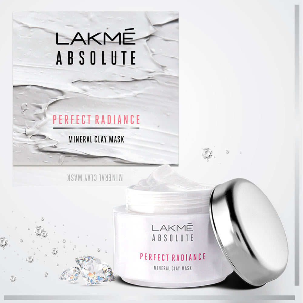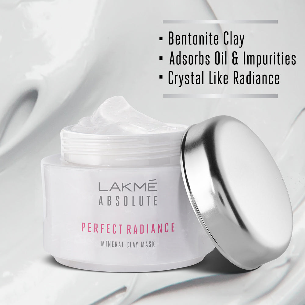 "Lakme Absolute Perfect Radiance Mineral Clay Mask, enriched with mineral clays and precious crystals this mask brightens your skin. The clay adsorbs oil & impurities from within the pores and its advanced skin Brightening formula is infused with vitamins to give you a radiant, flawless skin. Pollution, dirt and other impurities that get accumulated on your face after a long day are washed off to cleanse that skin thoroughly. Unmask the bright illuminated look with Perfect Radiance Mineral Clay Mask. Polished skin now begins at home with a simple yet luxurious day and night ritual designed with utmost care just for you. It is suitable for all skin types and can be used in all weather conditions. For optimum results, try the absolute perfect radiance skin care regime: