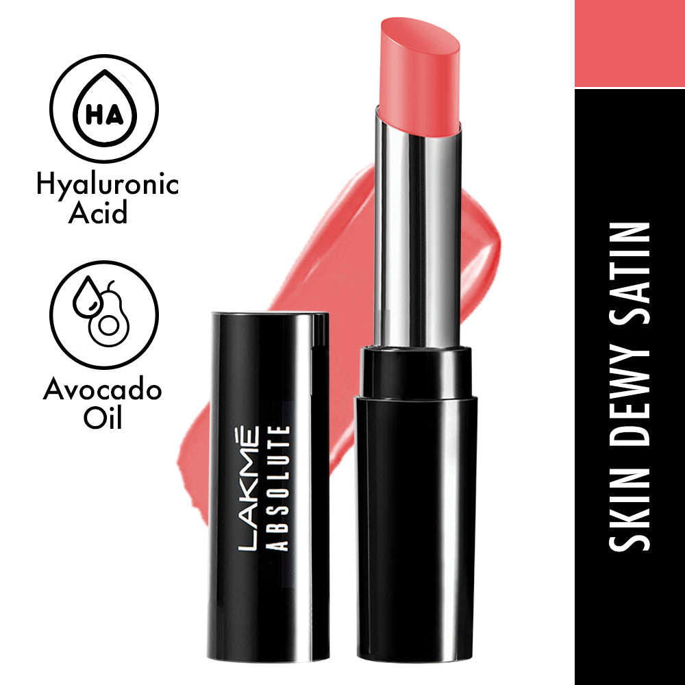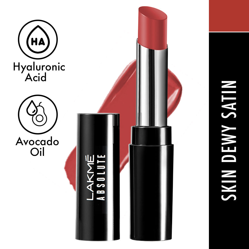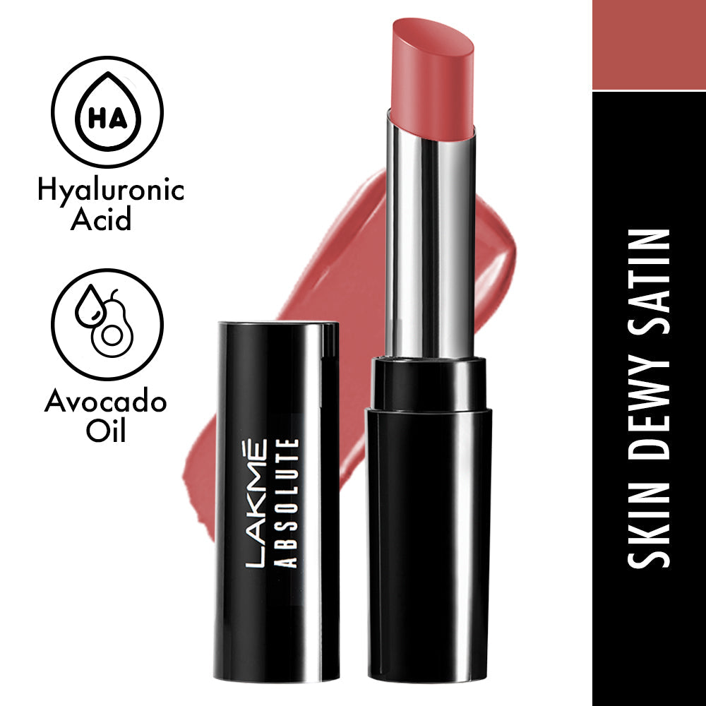 "Introducing Lakmé Absolute Skin Dew Satin Lipstick, a luxurious lipstick that has the perfect combination of high coverage, vibrant colour, and moisturising benefits to create a high shine, high glam look. This lipstick features a lush satin finish that delivers a velvety-smooth texture to the lips, creating a sophisticated look that lasts for hours. The intense pigmentation of the lipstick offers high coverage and rich colour in just one stroke, making it the perfect choice for those who want a bold and vibrant look. The hydrating and moisturizing benefits of the Lakmé Absolute Skin Dew Satin Lipstick make it an excellent choice for those with drier lips. Infused with Avocado Oil and Hyaluronic Acid, this lipstick hydrates and nourishes your lips, leaving them feeling soft and supple. In addition to its moisturising benefits, this lipstick also creates a dewy look that adds a youthful and fresh appearance to your makeup. The serum-infused satin soft texture of the lipstick glides smoothly over the lips, creating a seamless, flawless look that is perfect for any occasion. It is the go-to lipstick for any makeup lover! With its beautiful satin finish, high coverage, rich dewy color and hydrating properties, the Lakmé Absolute Skin Dew Satin Lipstick is the perfect showstopping essential that’ll leave your lips feeling nourished and ensure you look stunning!"
