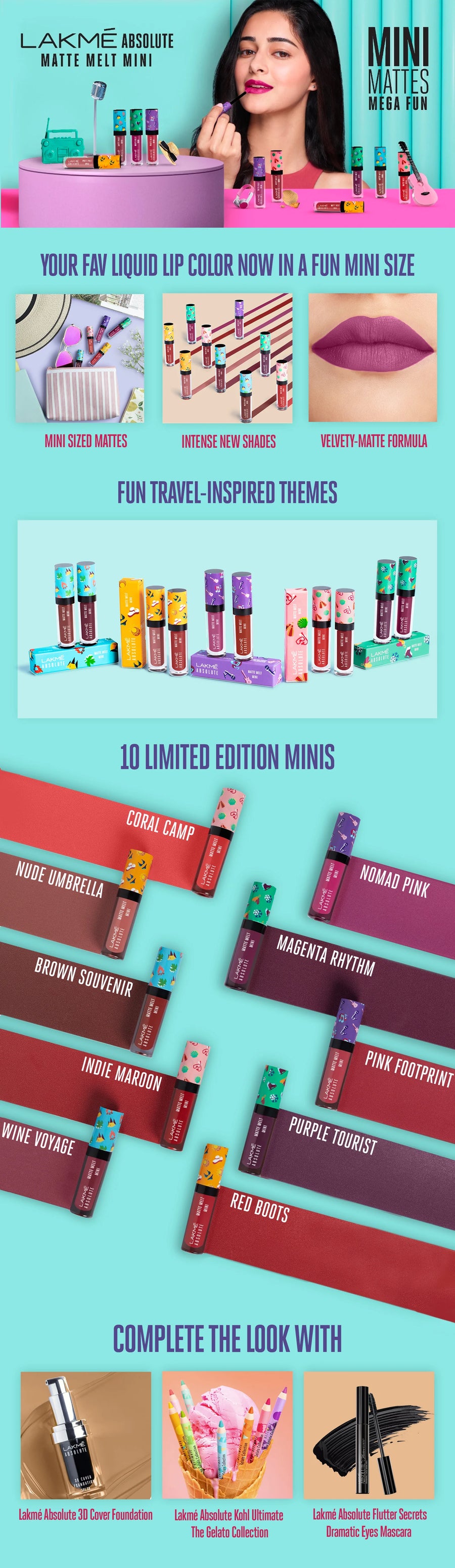 "Turn up the fun with every swipe of Lakmé Beyond Matte Lip Liquid! Available in 8 limited edition shades and vibrant travel-friendly packaging. This mini-liquid lip colour will instantly become a staple in your makeup pouch. These fun-sized mini mattes will be your constant companion everywhere you go! The matte formula is long-wear by nature|| feels feather-light, lightweight on your lips and gives you an intense colour payoff in one stroke in a single application. It makes your lips look lush with a velvety matte texture that instantly delivers a stunning suede-like finish. Lakmé Beyond Matte Lip Liquid comes in gorgeous shades of Reds|| Pinks|| Corals|| Browns & Wines. With its mini size and cute packaging you are bound to fall in love with all of them. These mini mattes are transfer-proof and enwrap your lips in a long-lasting silky comfort without drying them out. The wand is specially designed to give your lips an even colour. Why bother choosing your favourite|| when you can have all of them? Get your hands on this irresistible collection right away and get your adventure started. Pick your favourites from the five travel-inspired themes: Winter Festival|| Music Festival|| Camping|| Tropical Beach and Snorkelling."