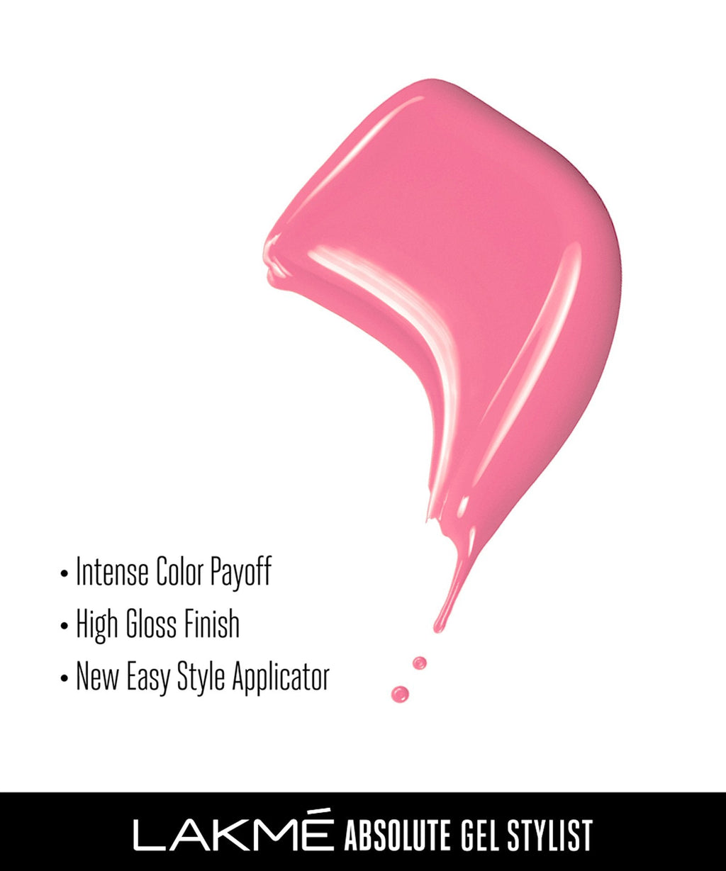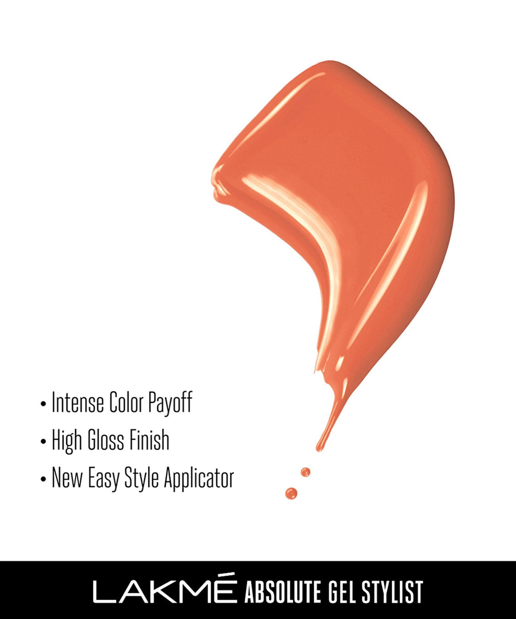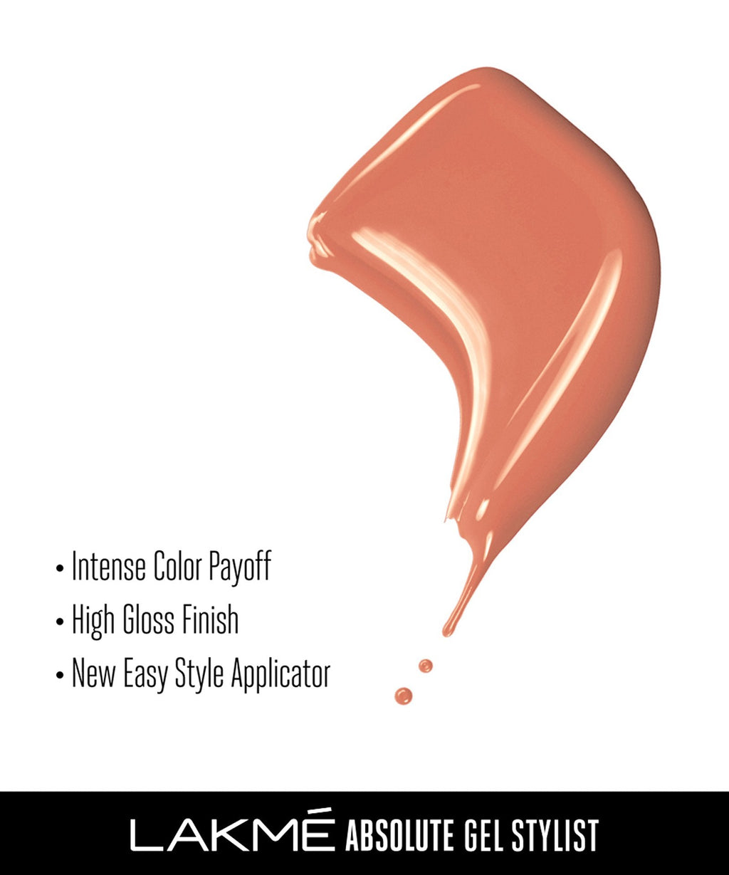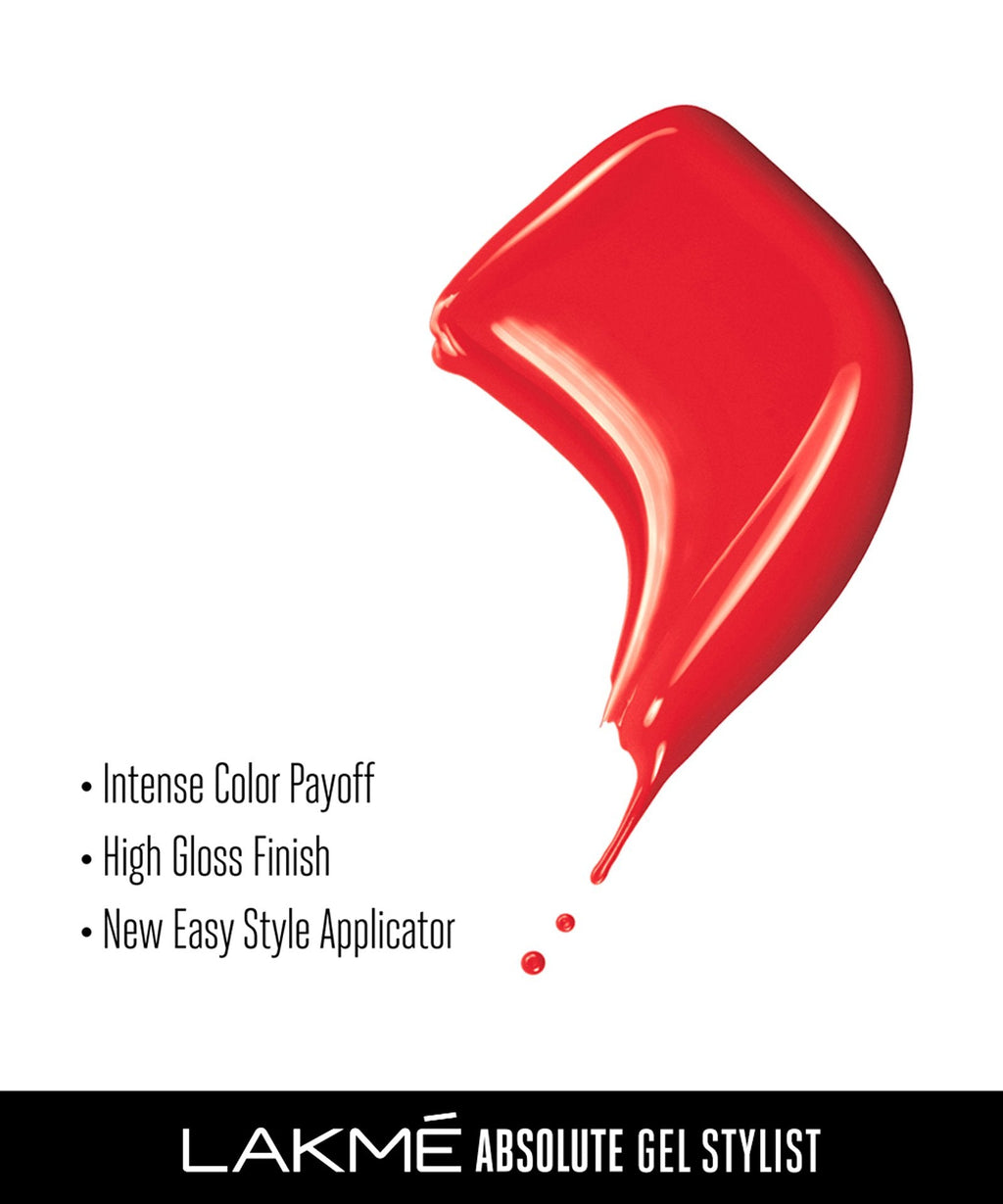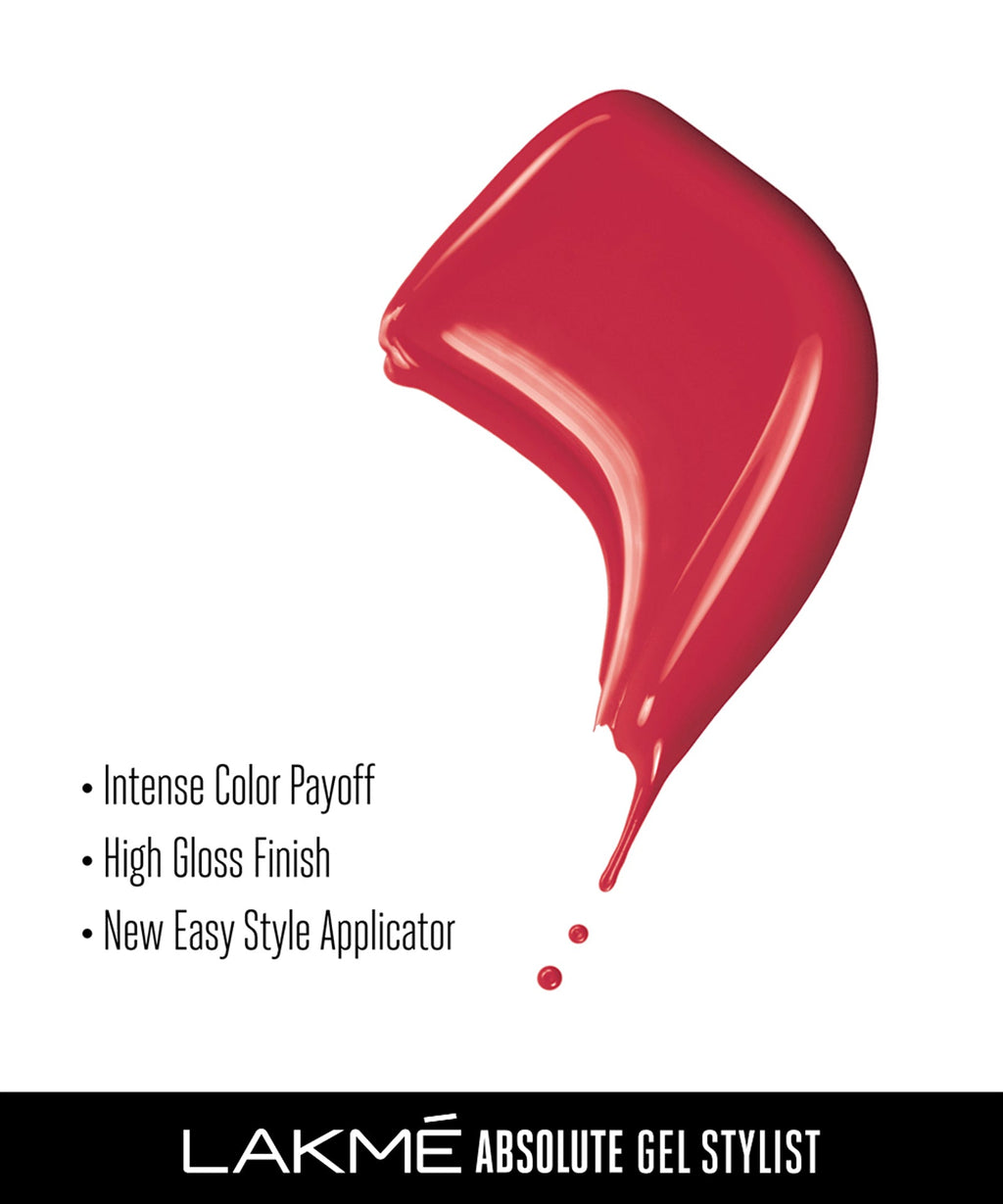 Lakmé Absolute Gel Stylist Presenting the Lakmé Absolute Gel Stylist Nail Color range - an exclusive collection of 15 glossy shades, now in an all-new bottle. It gives you long lasting gel-like nails and an extremely high gloss finish with every application. Choose from a wide range inclusive of nudes, reds, pinks, glitter and metallic shades that you can wear every day, or during festivities. Its new design includes the innovative applicator that glides easily onto your nails to a deliver glossy finish in one quick swipe. Get lasting rich color payoff with an intense glossy finish in 15 shades. Complete your gel nails look with the Top Coat.