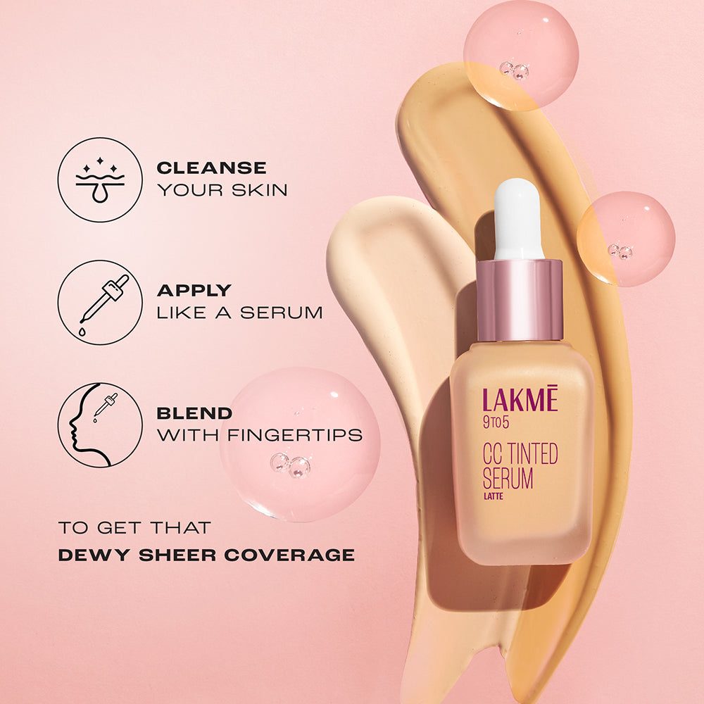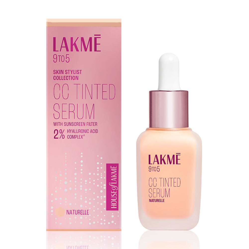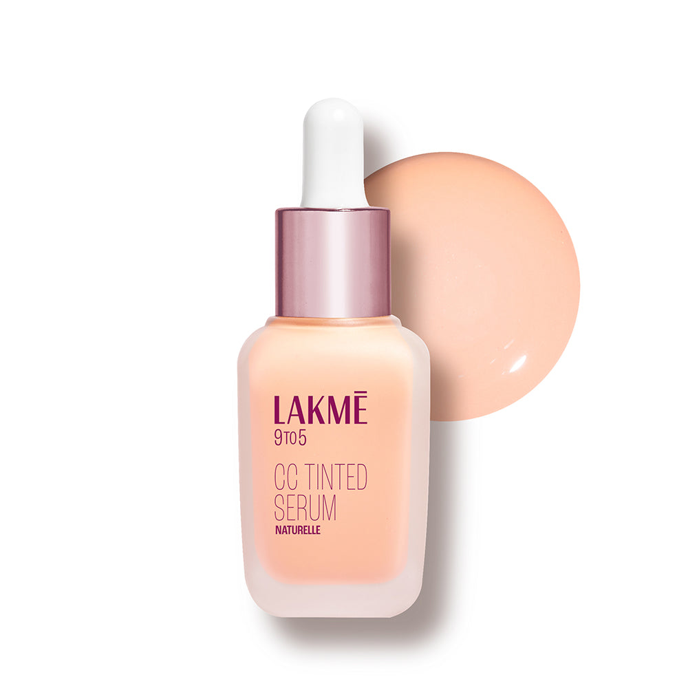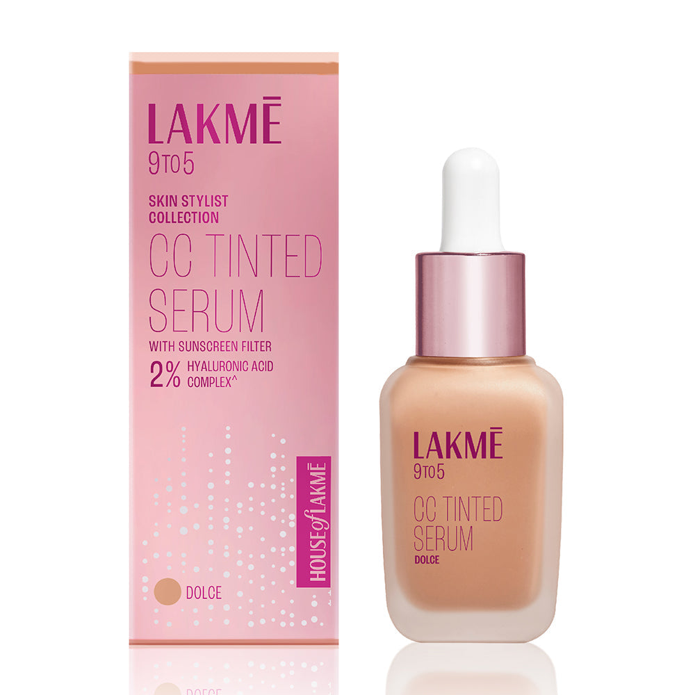 "Introducing Lakme 9 TO 5 CC Tinted Serum - where makeup meets skincare in the most epic way possible! Picture this: it is like the ultimate fusion of a Complexion Care Cream and a serum, giving you that lit-from-within dewy glow without weighing you down. Packed with 2% Hyaluronic Acid Complex* and Sunscreen Filters, it is not just about looking good, it is about treating your skin like the queen it is. This ‘No Makeup - Makeup Look’ is all about being effortless, as it offers dewy sheer coverage while taking good care of your skin. Whether your skin type is Oily, Dry, or Combination, Lakme 9 TO 5 CC Tinted Serum has got you. It's about having the power of a serum and the sheer finish of a foundation all rolled into one. Cleanse your skin - Apply like a serum - Blend it with your fingertips to get that Dewy Sheer Coverage. With four stunning shades- Latte, Naturelle, Dolce, and Crème—you'll find your perfect match in no time. Lakme 9 TO 5 CC Tinted Serum - Potent like serum and coverage like foundation. Makeup in now your Skincare too! *Refers to Hyaluronic acid, Pentylene Glycol, Ethylhexylglycerin and Aqua"