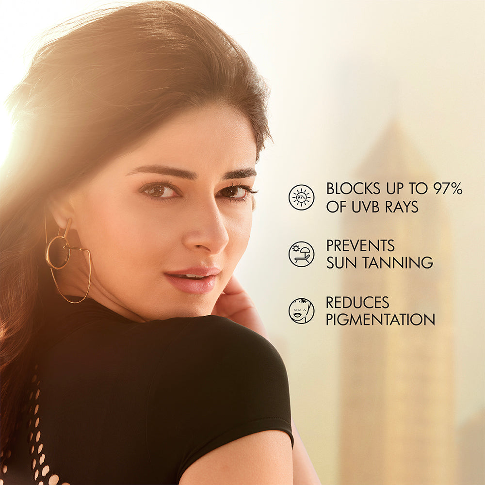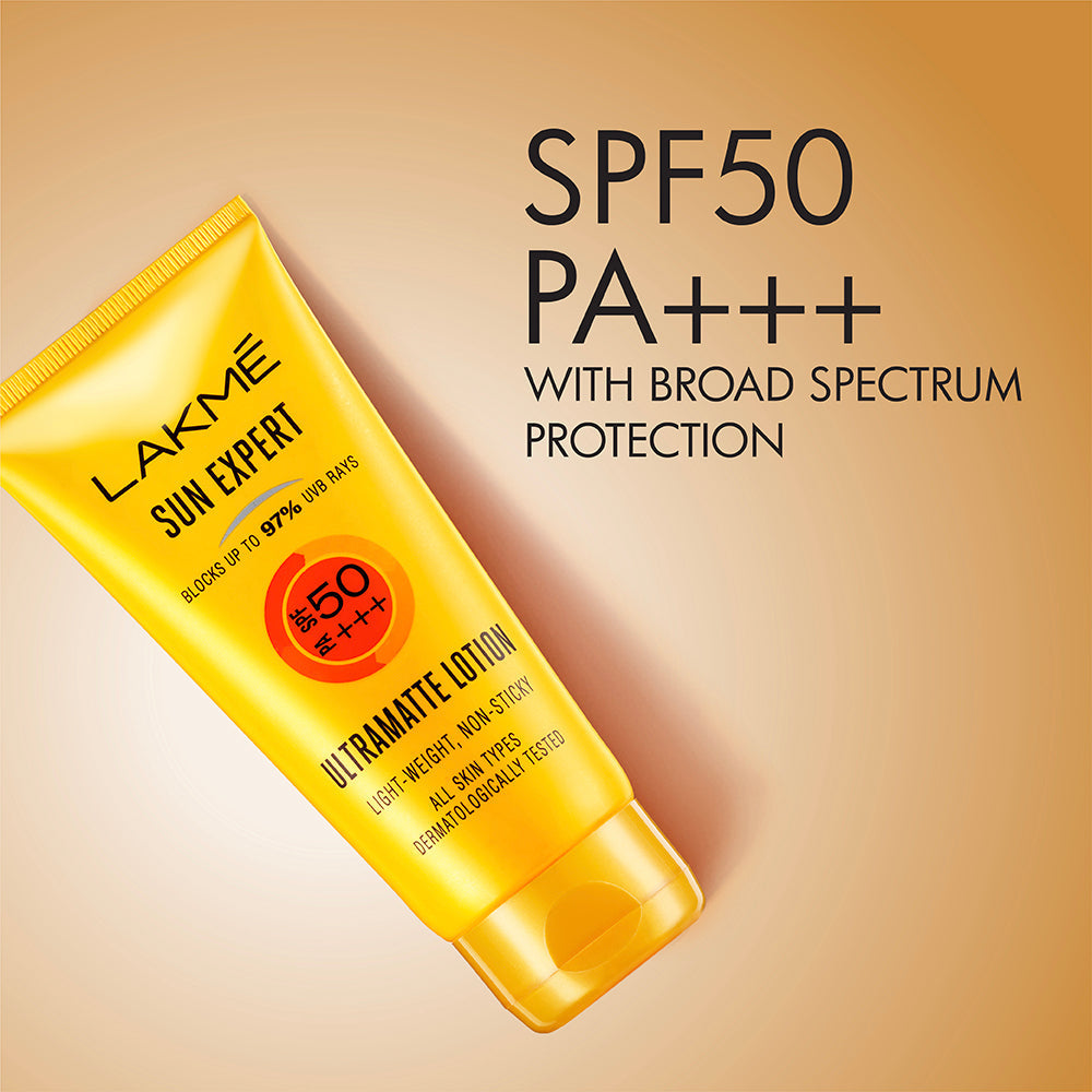 Think sunscreens are needed just on holiday? Think again - it takes just 7 minutes for the sun to start damaging your skin in this hot Indian weather. Choose Lakmé Sun Expert - your daily sunscreen lotion which is light enough to be used all year round. Suitable for all skin types - this lightweight lotion provides broad spectrum UV protection. SPF 50 blocks upto 97% harmful rays of UVB which causes sunburns & PA+++ shields from UVA rays which cause dark spots, premature aging and skin darkening. What are you waiting for - grab the best protection under the sun and say goodbye to sun damage!