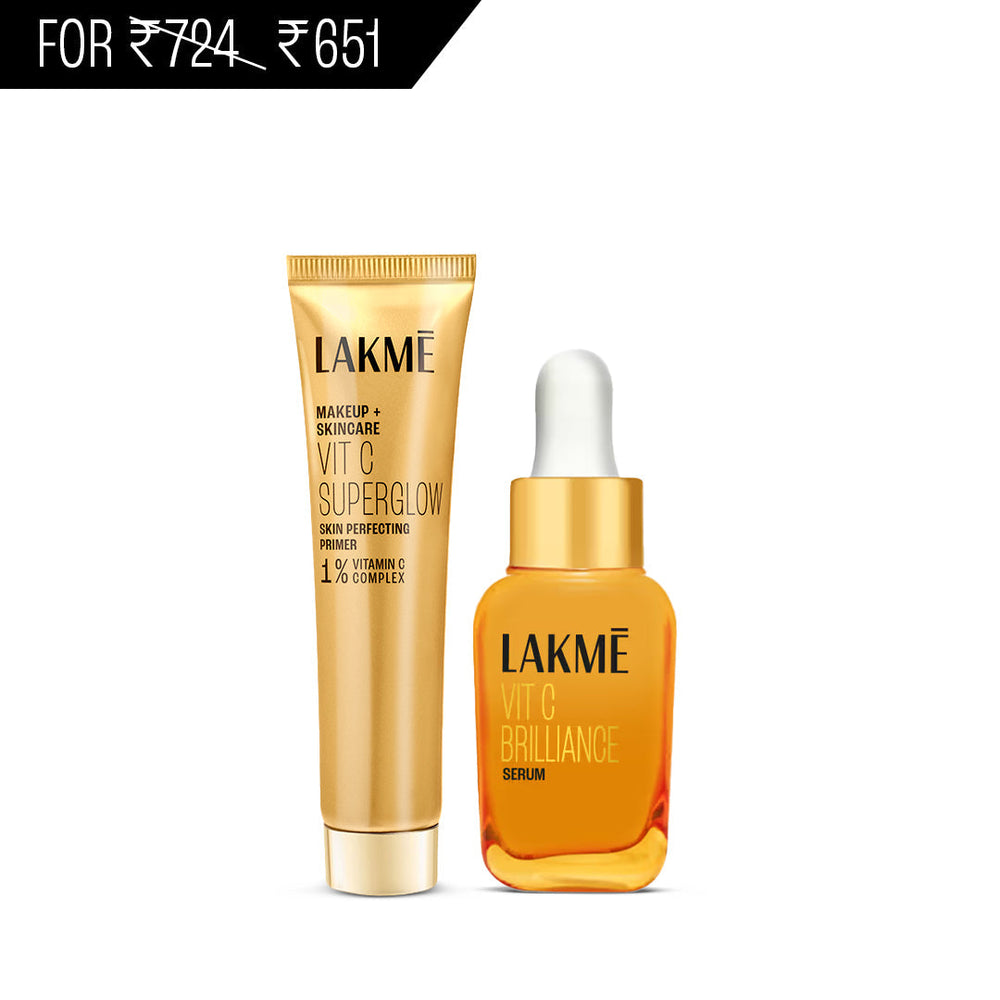 value set skincare Lakmē Makeup+Skincare VitC Superglow Skin Perfecting Primer: Ever used makeup that’s good for your skin? Let us loop you in. Introducing new Lakme Vit C Superglow Skin Perfecting Primer with 1% Vitamin C Complex, your new beauty must-have to prep, protect and perfect your base. Infused with the goodness of 96% skincare ingredients like brightening Vitamin C and antioxidant Vitamin E, it gives glowing, even tone, hydrated skin. This blurring elixir also has skin smoothening emollients that minimize pores and imperfections for a smooth, makeup ready base. Its airlight formula seamlessly glides onto skin, leaving it feeling hydrated, velvety-smooth, and glam-ready. Backed by the power of skincare science, the elastomer gels in this primer cling together to form an ultra smooth veil that holds makeup in place ensuring makeup looks better and lasts longer. As you apply this primer, its protective film formers provide a barrier that shields your skin from skin damaging agents. Moreover, it absorbs excess oil and mattifies for a flawless and fresh matte finish. Embrace luxury in every swipe and experience the transformative power of skincare first makeup. With an indulgent texture and a 2-in-1 makeup+skincare formula that performs effortlessly, Lakme Vit C Skin Perfecting Primer is the epitome of natural, radiant glam.