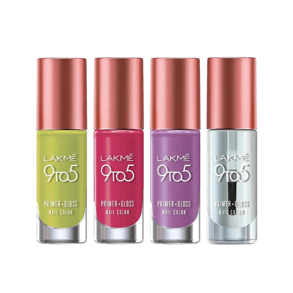 Get everyday perfect nails with Lakmé 9to5 Primer + Gloss Nail Colour. The perfect Primer + Gloss Nail Colour range has colours that dry quickly, giving your nails a long lasting, intense, glossy shine. Now coat your nails with vibrant colour that stays through your busy work days. Available in a wide range of 19 bright colours and 1 Top Coat that gives an added glossy finish. A nail paint for everyday use, these shades are simply a must-have!